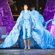 “The body is the point of arrival and departure, nakedness reproduced in shrunken scale on trompe l’oeil pieces, the elementarity of underwear and base layers exposed as an external self. LEDs and lights illuminate coats, the waistline and the sides of trousers, and profile of shoes, like a glow coming directly from the body being projected outward,” describes Loewe about their latest collection.
